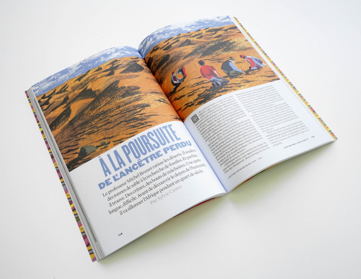 À la poursuite de l’ancêtre perdu, 2018, illustrations pour la revue XXI, hiver 2018.